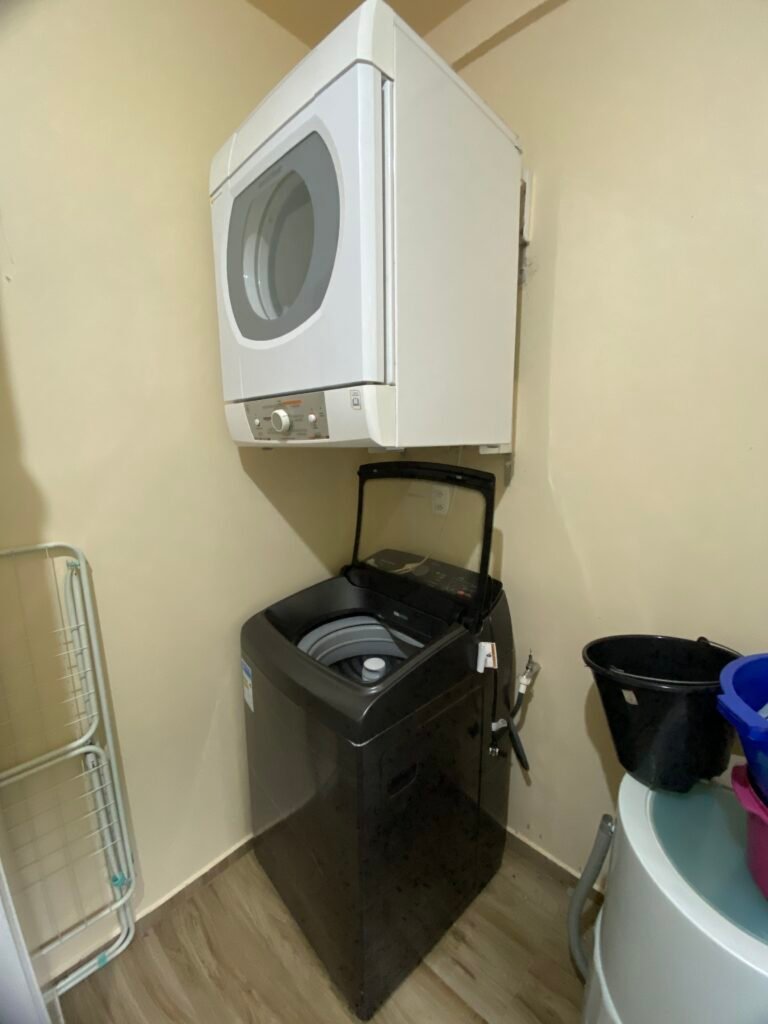 - Primeiramente: Máquina de lavar embaixo, secadora em cima