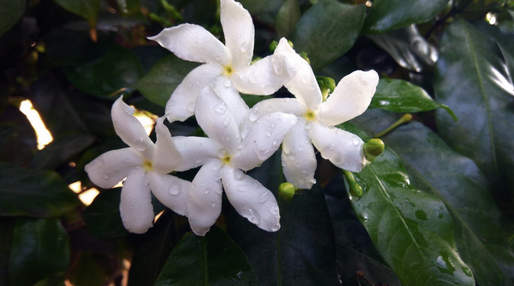 • Jasmim-estrela (Trachelospermum jasminoides): Tecnicamente não é jasmim verdadeiro mas tem perfume similar e flores em formato de estrela