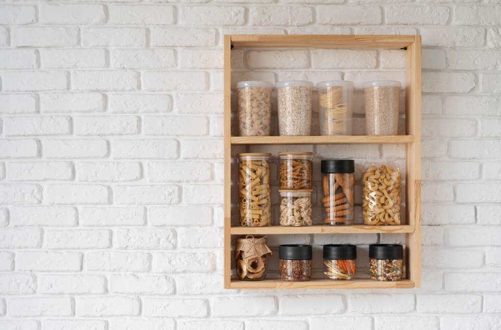 Use potes de vidro reciclados ou compre opções baratas para armazenar grãos, farinhas e temperos. Ademais, adicione etiquetas bonitas para criar um visual uniforme e organizado.